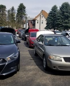 Pastor Steve preaches today’s Sunday Services from the church’s balcony while the congregation, parked in their vehicles in the parking lot, listen to the services on their FM car radios.
